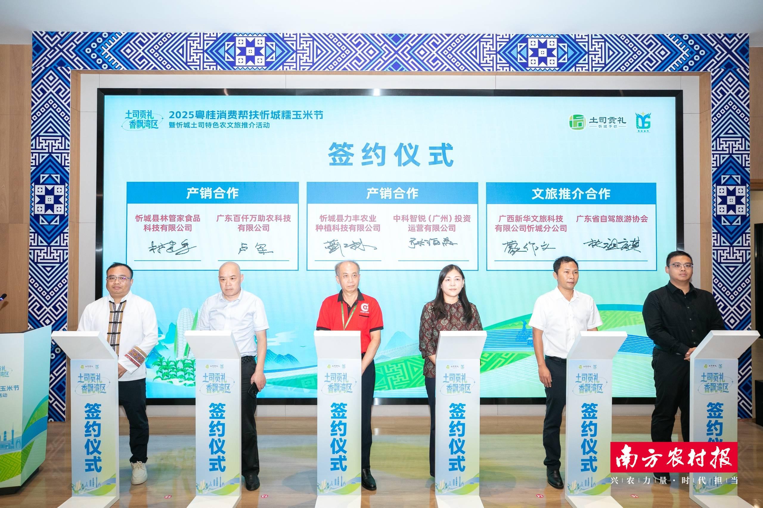 活动现场,忻城有关企业与湾区签订了购销协议。据了解,此次签约旨在推动“土司贡礼”区域公用品牌下的忻城糯玉米、金银花等特色珍宝走出大山,走进粤港澳大湾区的千家万户。