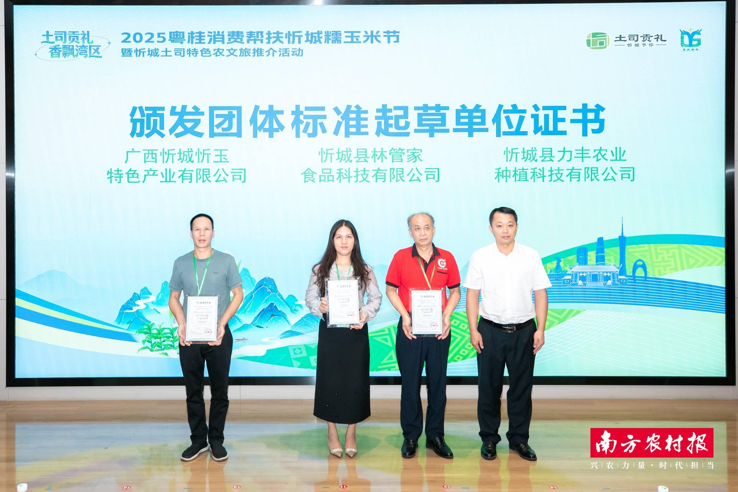 活动现场,忻城糯玉米产品新包装、《糯玉米糁》团体标准正式发布,团体标准的发布填补了国内该品类标准空白。据介绍,该标准由粤桂协作工作队推动,广东消费帮扶联盟、广东省食品流通协会及忻城本地多部门联合制定。